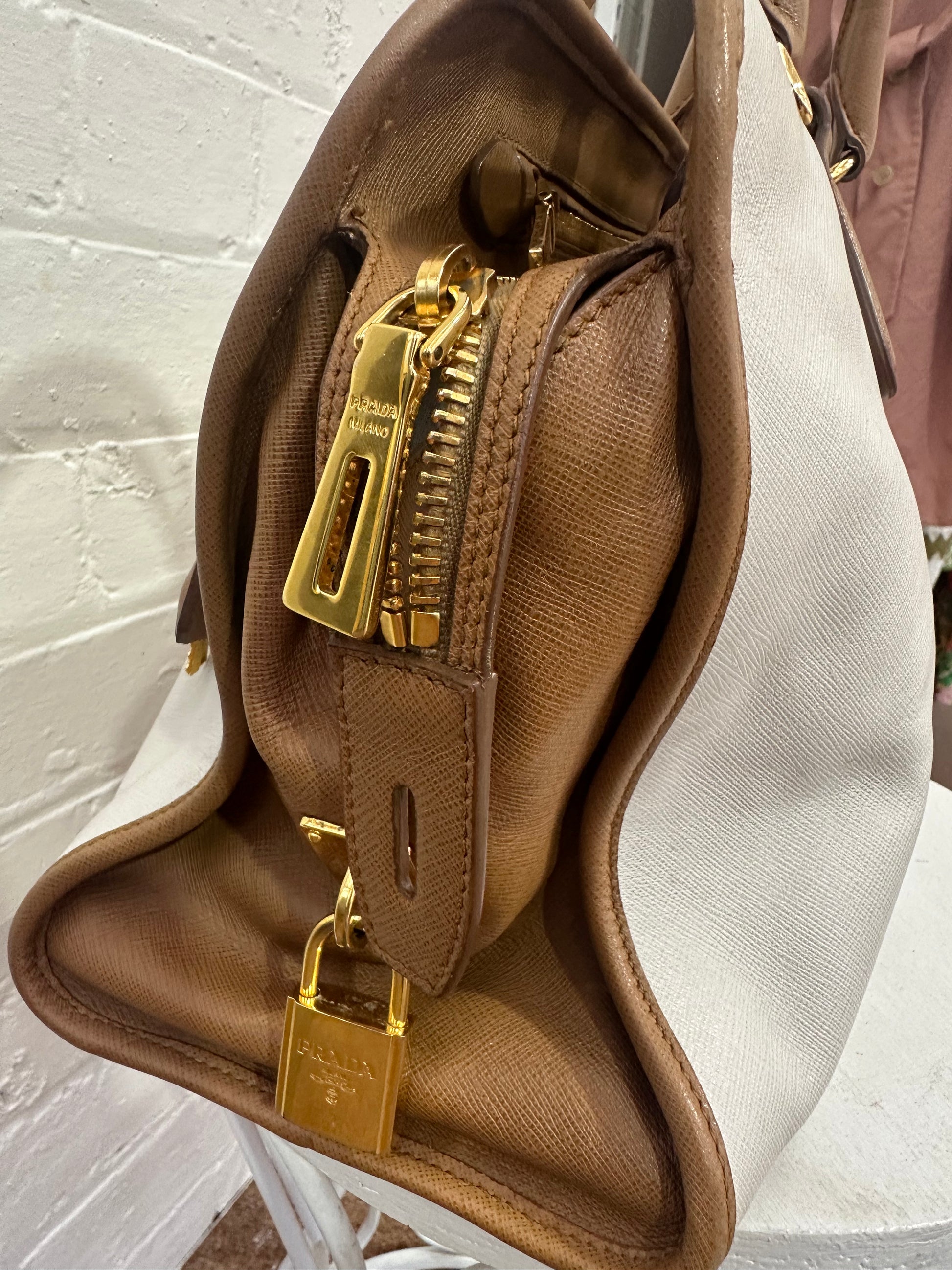 PRADA BROWN/OFF WHITE SAFFIANO LUX LEATHER CANAPA TOTE